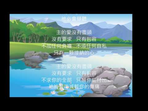 河水的盡頭是海底 一天的盡頭是黑夜 黎明和黃昏 白雪和沙漠 相對卻存在這世界 若你心靈傷悲 就真心請祂安慰 若你願意說出 祂必會傾聽 主的愛沒有盡頭 沒有要求 只有包容 不加任何負擔 不添任何自私 只有一顆接納的心 主的愛沒有盡頭 沒有要求 只有包容 不求你的全部 只願你能付出 祂的愛能減輕你的傷痛 祂的愛永遠無盡頭 「天地必要毀滅,而祢永遠存在;祢永存不變,祢的壽命無盡無限。」(詠102:27,28) 請在此下載歌譜